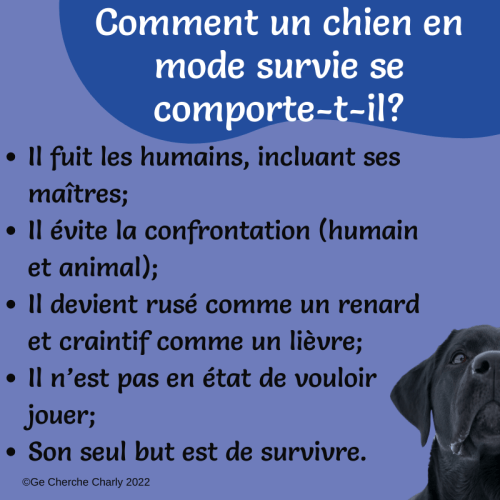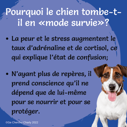 Le mode survie est un état de choc psychologique. Le chien réagit à la peur et au stress en régressant à ses instincts de base. Ce changement, causé par une montée de cortisol et d’adrénaline, rend le chien méconnaissable, même aux yeux de ses proches.