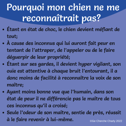 Lorsqu’un chien se perd, il peut entrer dans un état de choc psychologique appelé mode survie. Il ne reconnaît plus ses repères, fuit tout contact – même avec ses propres maîtres – et agit comme un animal sauvage. Cette fiche éducative explique ce phénomène méconnu mais fréquent, ses déclencheurs, les comportements typiques, et pourquoi il est essentiel d’adopter une approche calme, stratégique et respectueuse pour espérer ramener le chien en sécurité.